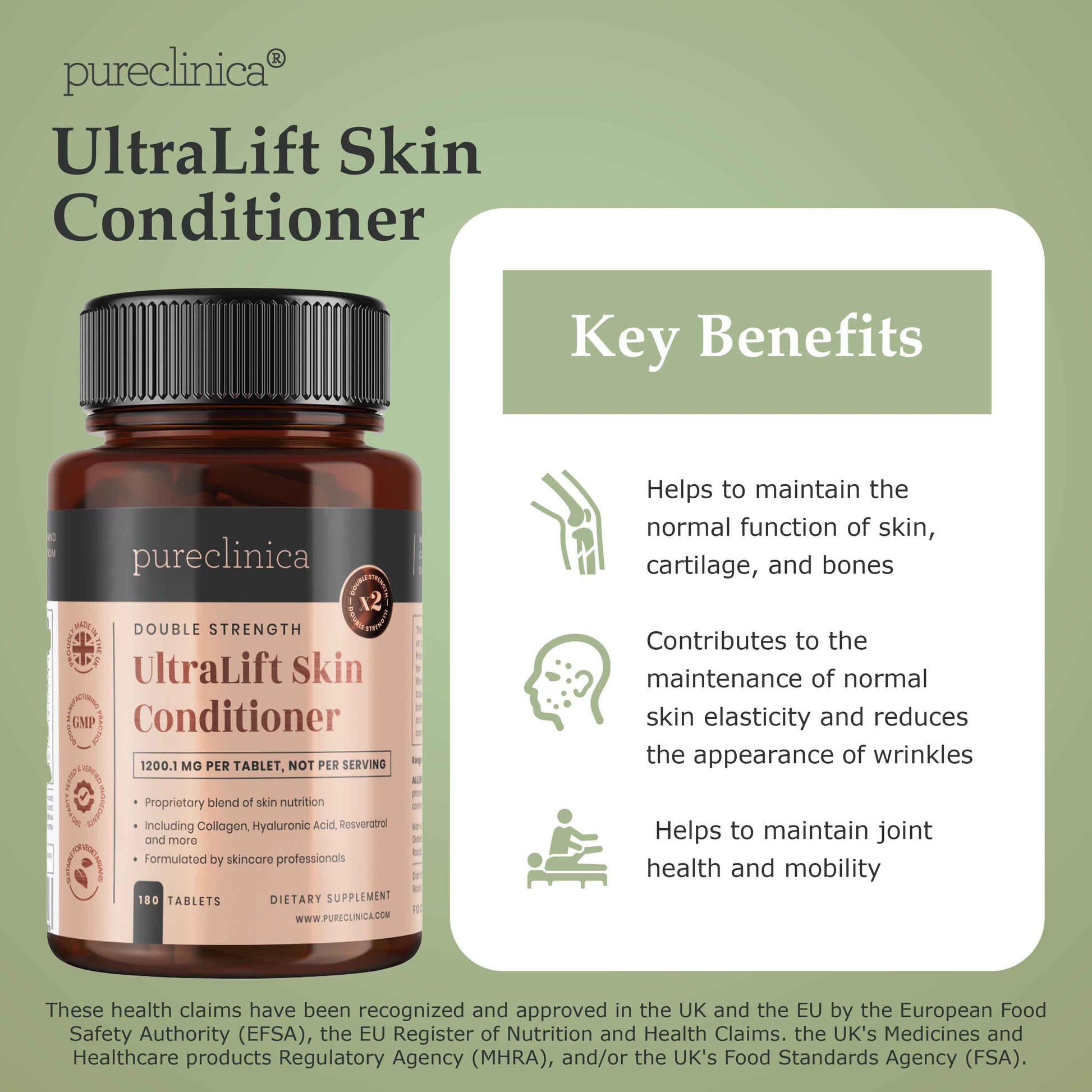 Revitalize your skin with UltraLift, a dynamic skin conditioning supplement crafted with a blend of 10 exceptional ingredients. Taking a targeted three-pronged approach to enhance your skin's well-being: