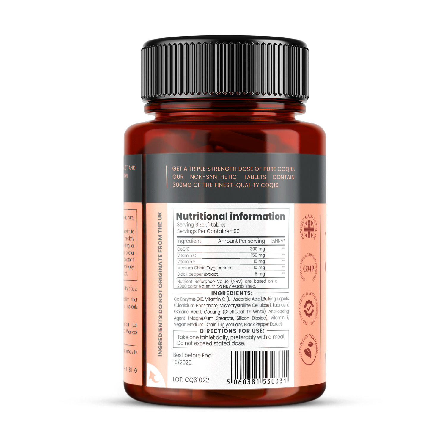 300mg of non-synthetic fermented Co Q10 in every tablet, fortified with vitamin C & E, plus black pepper extract for increased absorption and benefits.