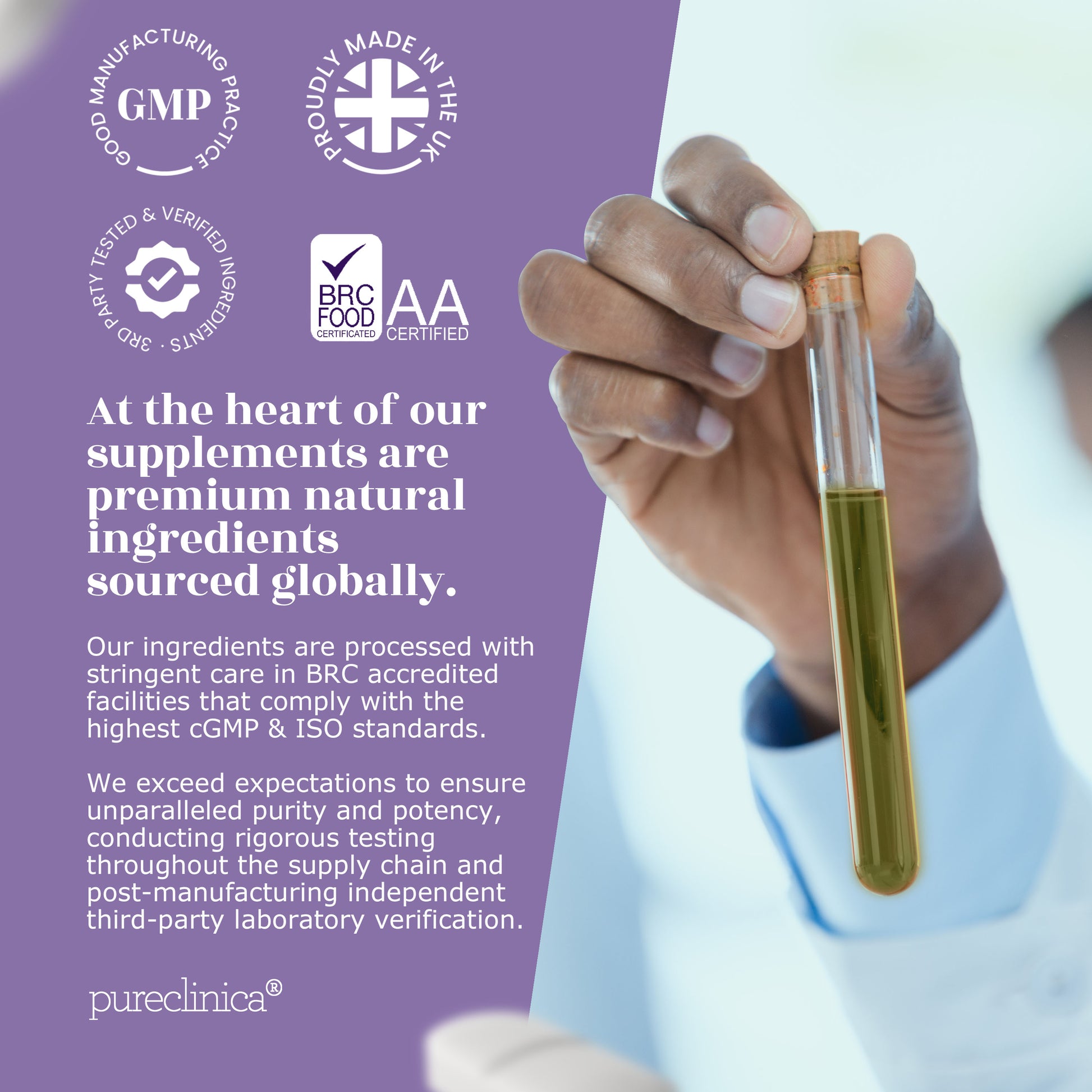 That starts with traceable, select ingredients, sourced for their strength and efficacy. At our UK, US, and Netherland's based facilities, certified to CGMP, ISO, and BRC standards, every step is purposefully engineered for precision and control. Advanced extraction and purification methods radically improve potency while removing impurities, without introducing toxic chemicals.