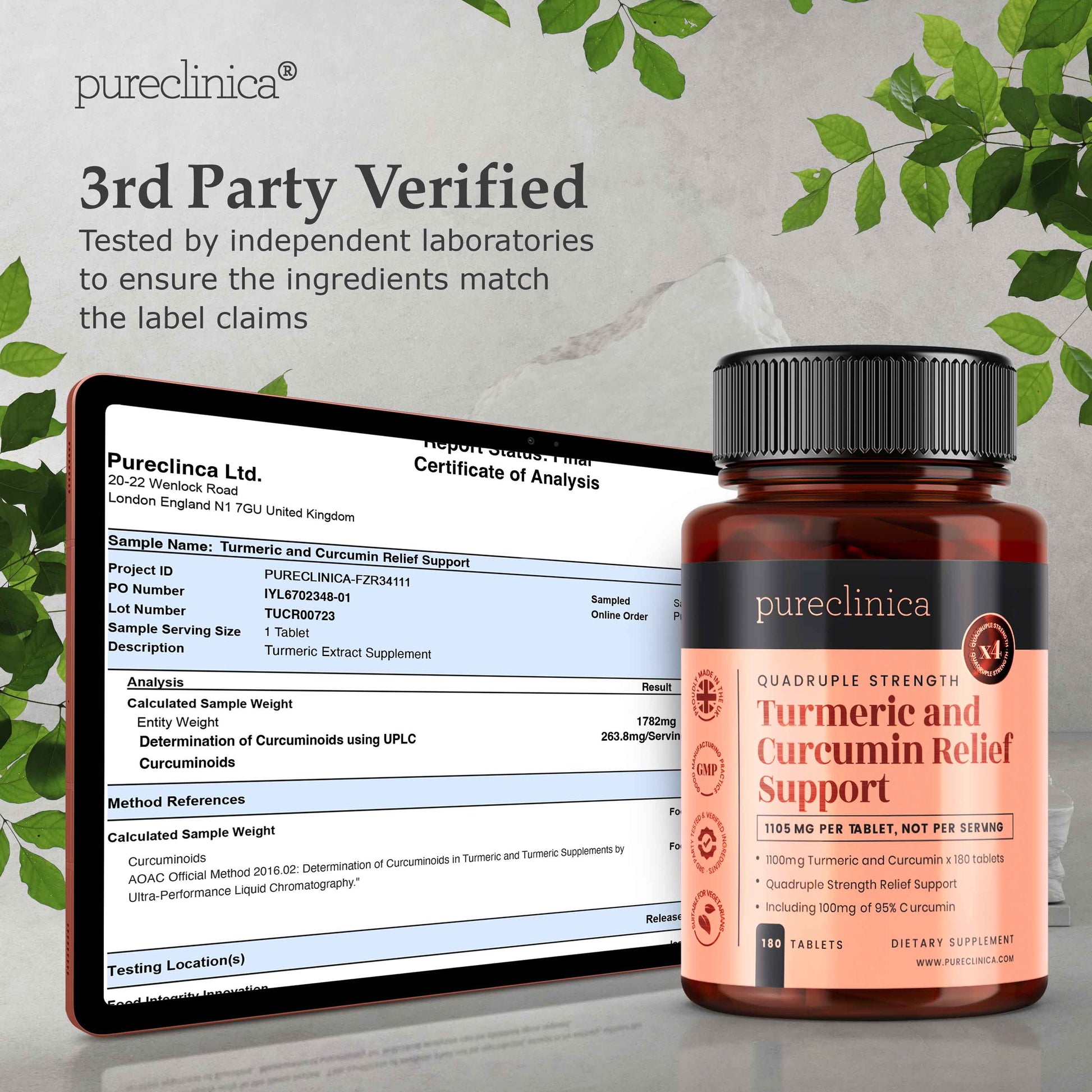 We understand how important it is for you to know exactly what you're putting in your body, which is why Turmeric and Curcumin Relief Support is thoroughly tested throughout manufacturing, and random batches are sent for independent third-party testing upon completion.
