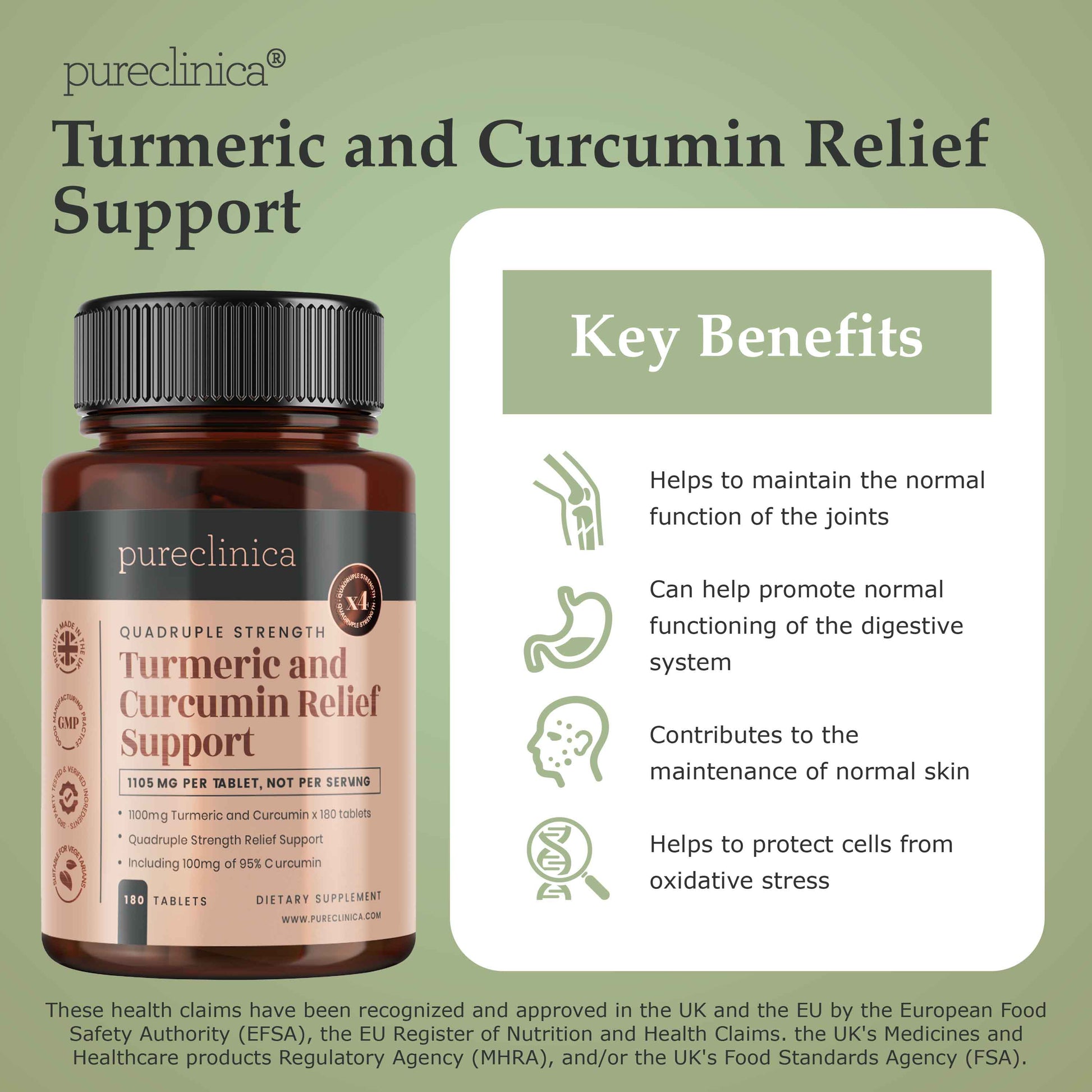 When compared to regular turmeric supplements, each Turmeric and Curcumin Relief Support tablet contains an average of 4x more of the bio-active curcuminoids.