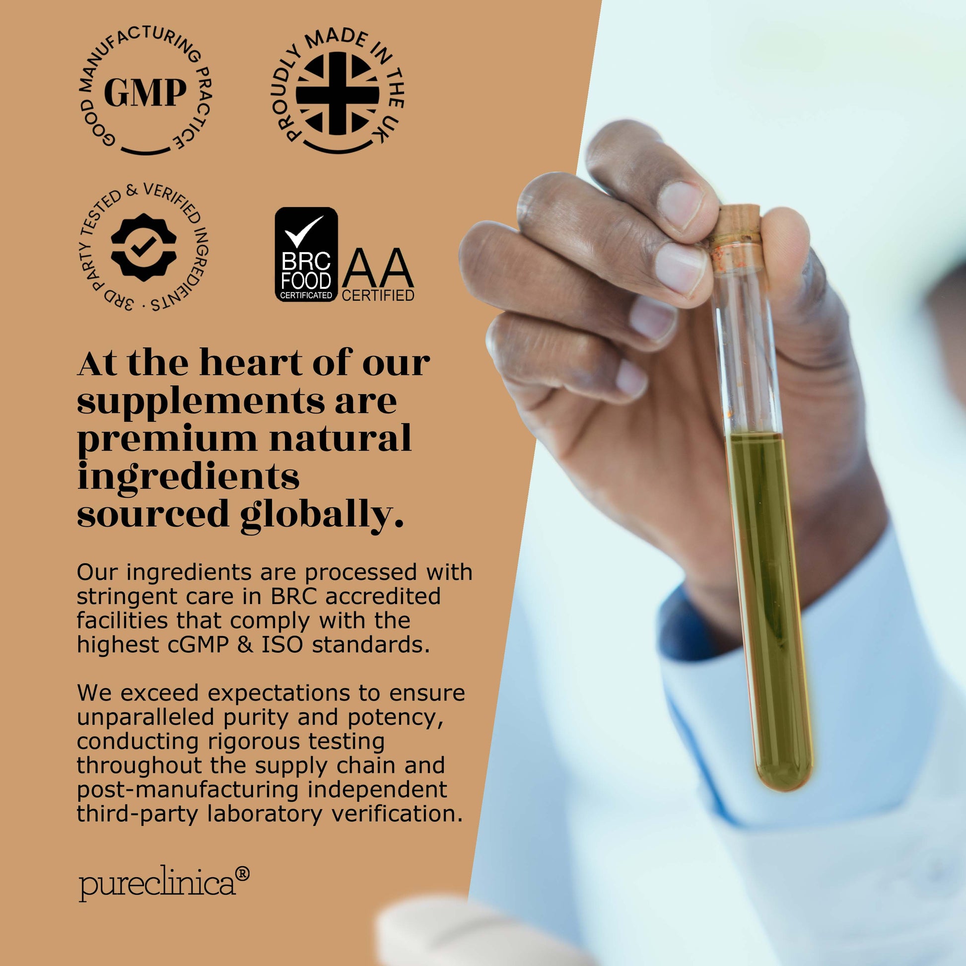 That starts with traceable, select ingredients, sourced for their strength and efficacy. At our UK, US, and Netherland's based facilities, certified to CGMP, ISO, and BRC standards, every step is purposefully engineered for precision and control. Advanced extraction and purification methods radically improve potency while removing impurities, without introducing toxic chemicals.