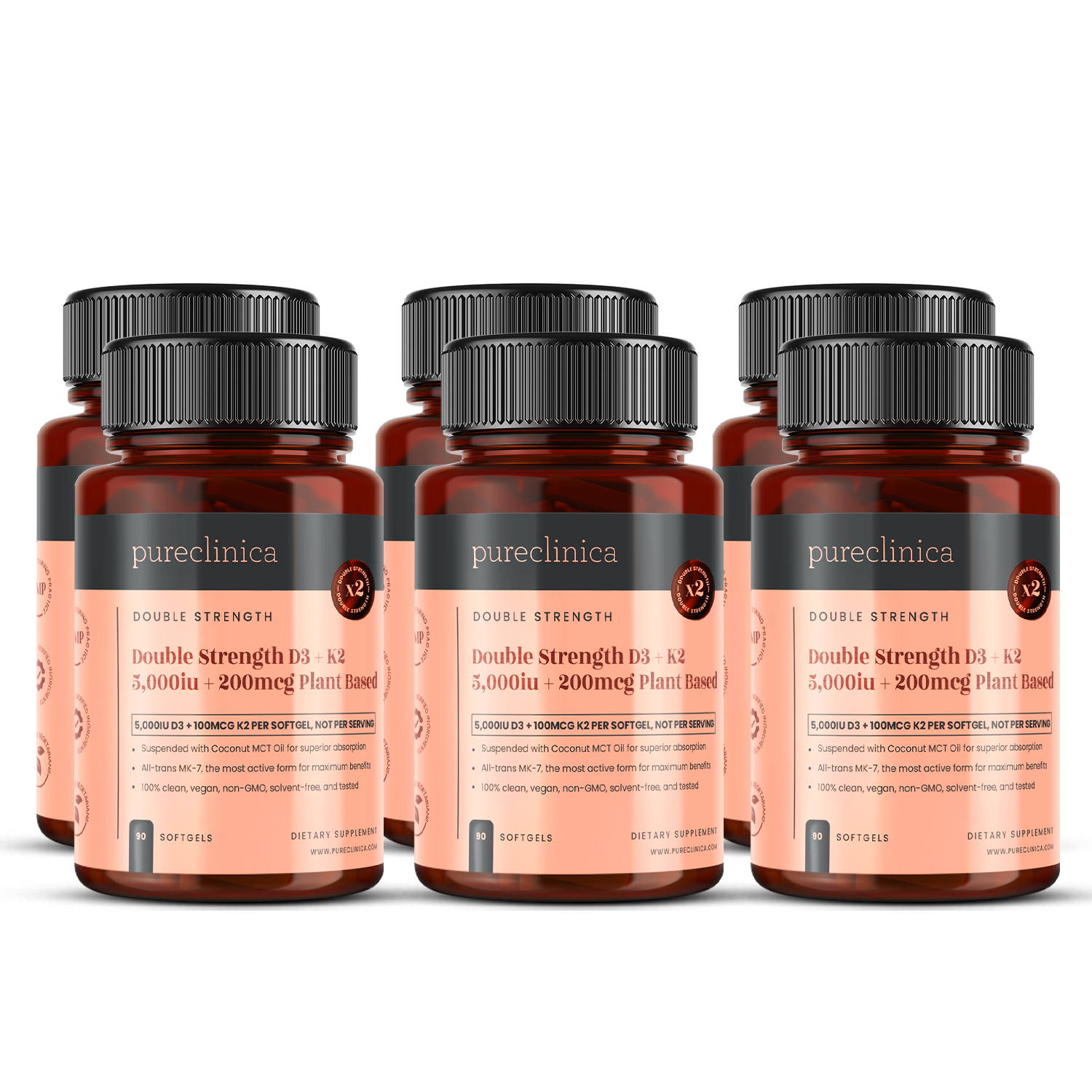 A simple combination of two essential vitamins—Vitamin D3 and Vitamin K2—delivered together in twice the strength of most other D3 + K2 supplements. Each softgel delivers 5,000 IU of vegan Vitamin D3 and 200 mcg of natto-fermented Vitamin K2 (MK-7).