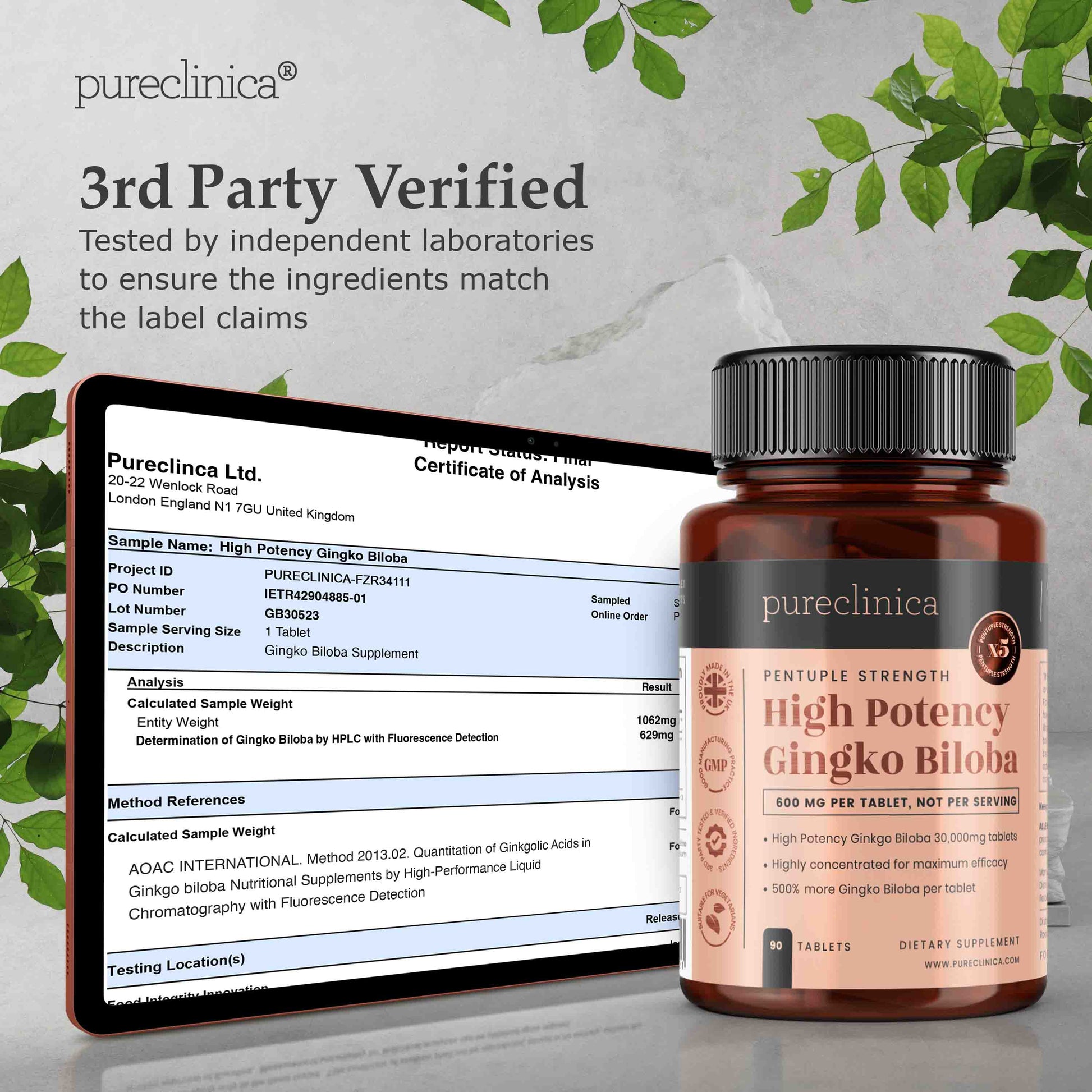 We uphold the highest standards of quality, purity, and transparency with every batch of our 5x- strength Ginkgo Biloba by subjecting it to rigorous testing throughout each of the carefully selected manufacturing processes, as well as third-party testing of the finished product.