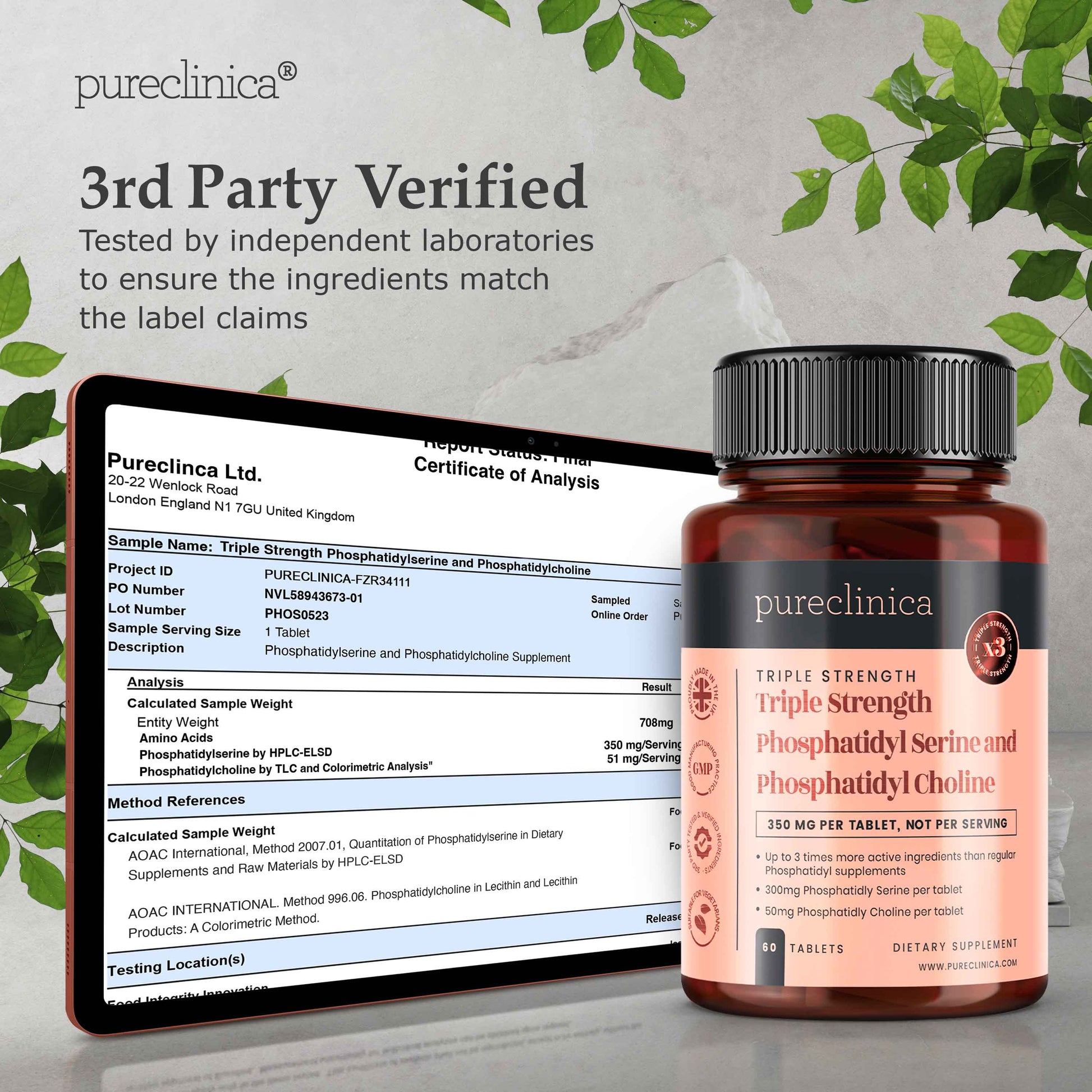 All of our supplements undergo rigorous third-party testing for quality, purity, and accuracy of label claims, ensuring superior effectiveness and quality products you can trust, Triple Strength Phosphatidylserine and Phosphatidylcholine is no exception.
