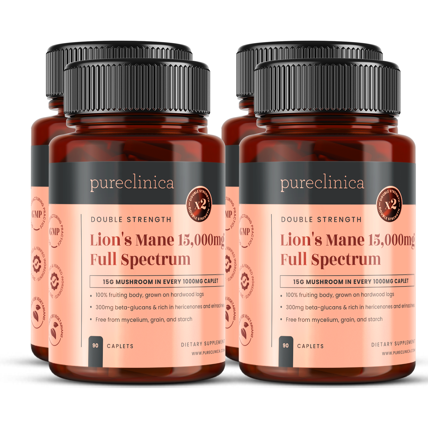 Ours is double-strength: each 1000 mg caplet packs the power of 15 grams of dried Lion’s Mane. Plus, we only use the fruiting body (the part of the mushroom where the active compounds live), never grain fillers or mycelium. It’s also standardized to 30% beta-glucans so you know exactly what you’re getting in every dose.